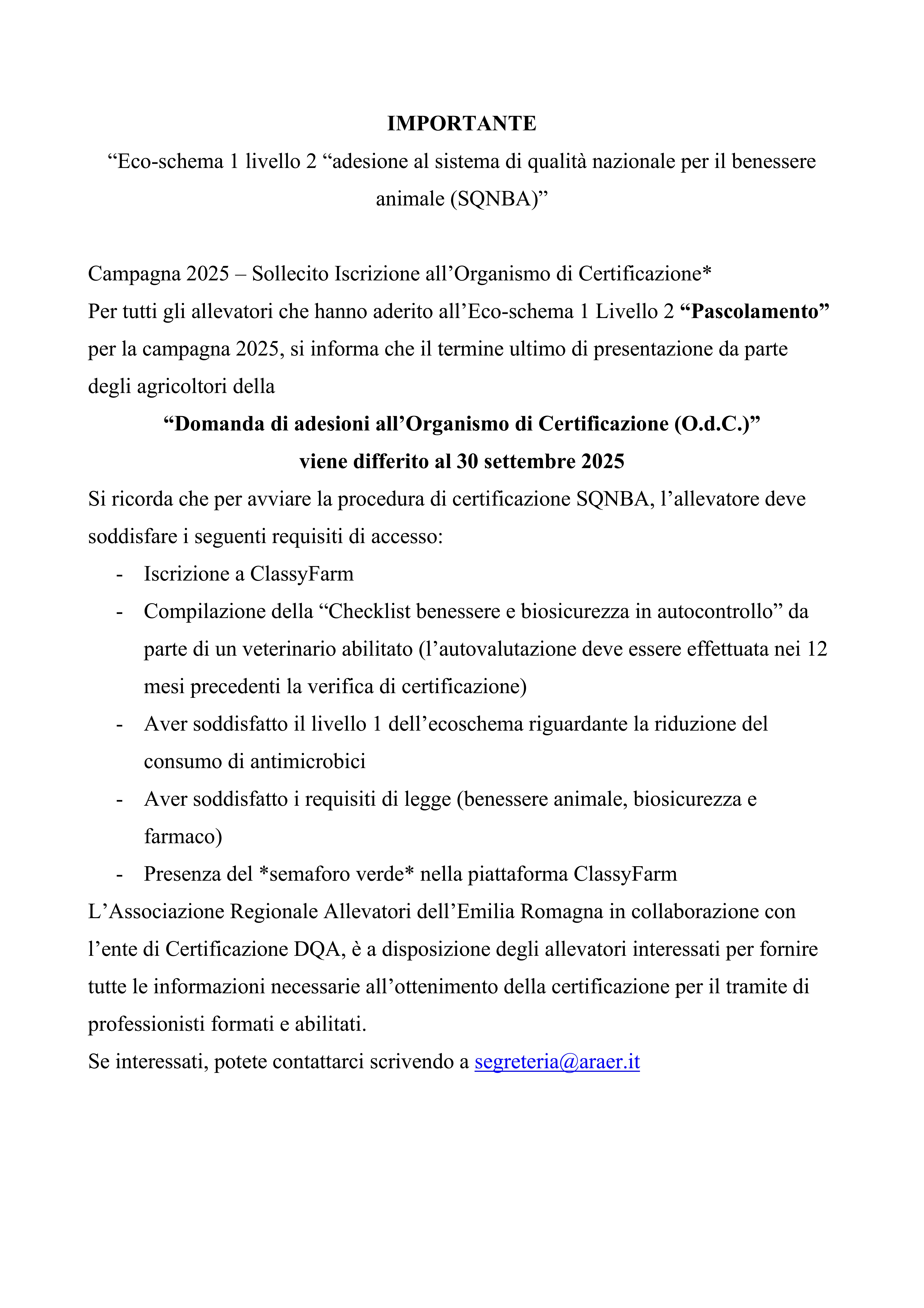 Eco-schema 1 livello 2 “adesione al sistema di qualità nazionale per il benessere animale (SQNBA)” |